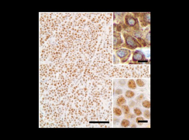 下部插圖是異常染色的細節;上部插圖描繪了漿細胞瘤中 CD79a 的典型細胞質染色。條 = 60 μm,兩個插圖條 = 5 μm。