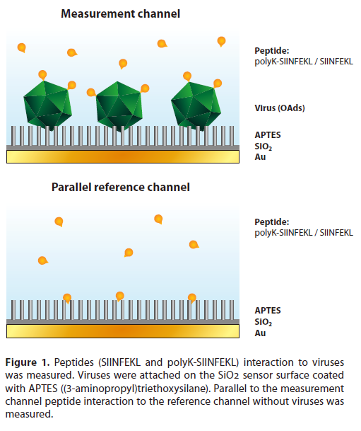 清洗后的BioNavis二氧化硅(SiO2)傳感器載玻片外涂有APTES((3-氨基丙基)三乙氧基硅烷),然后將溶瘤腺病毒原位固定在傳感器表面(圖1)。測量通道涂有病毒,而第二通道用作參考通道,不含病毒。用20 mM CHAPS(3-[(3-膽酰胺丙基二甲酰胺]-1-丙磺酸)清洗兩個通道,然后將多肽PolyKSIINFEKL或SIINFEKL平行注入兩個流動通道,并增加濃度。中性SIINFEKL是腫瘤特異性主要組織相容性復合體(MHC)肽I類表位,來源于雞卵白蛋白和polyK -SIINFEKL含有額外的聚賴氨酸(polyK)鏈,可在中性pH下將肽的凈電荷增加到+6 mV。