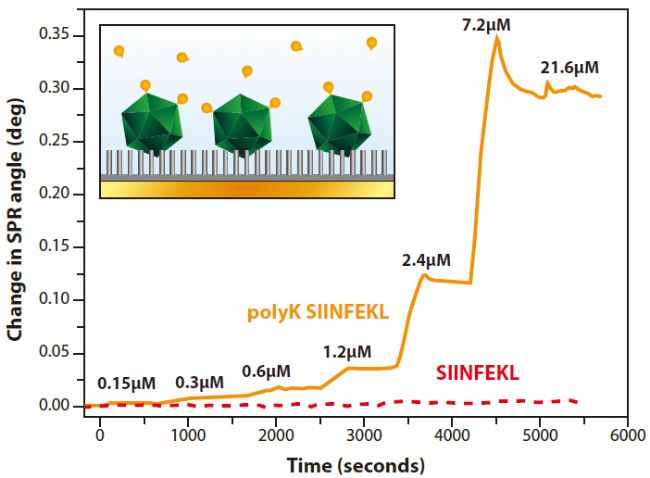 為了開發癌癥疫苗,用多參數表面等離子體共振(MP-SPR)測量了病毒與肽的相互作用。用多肽包被病毒以提高病毒的免疫原性。溶瘤腺病毒(OAds)附著在傳感器表面。實時測量oad附著的腫瘤特異性主要組織相容性復合體(MHC)肽。修飾的陽性多聚k -SIINFEKL肽與病毒表面結合(結合常數為2.88 × 10