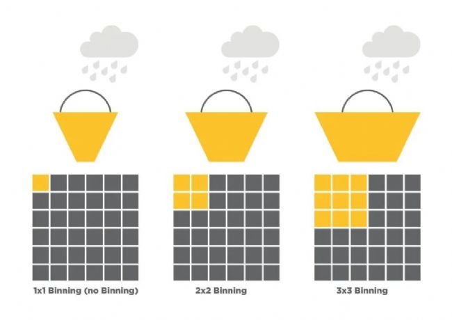 較小的像素可以合并,這意味著傳感器上相鄰像素的信號可以合并以創建單個更大的有效像素(稱為超像素),從而提高靈敏度,從而縮短曝光時間。像素合并的缺點是它確實會導致分辨率損失。3 桶圖形通過桶中捕獲雨水來解釋這一點。較大的水桶可以捕獲更大的雨滴量; 因此,更大的像素可以捕獲更多的光子。
