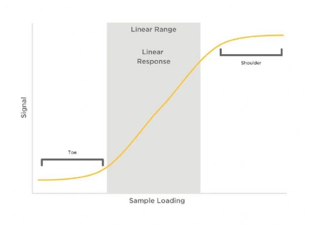 了解動態范圍對于正確分析數據和解釋蛋白質印跡結果至關重要。準確定量要求來自蛋白質條帶的信號落在成像系統的線性范圍內。條帶強度與線性范圍內蛋白質數量的關系是線性且成正比的。如果線性范圍之外的信號很弱或太強,它們可能會受到噪聲的影響,然后成像系統無法再準確記錄增加的信號(飽和),如圖所示。
