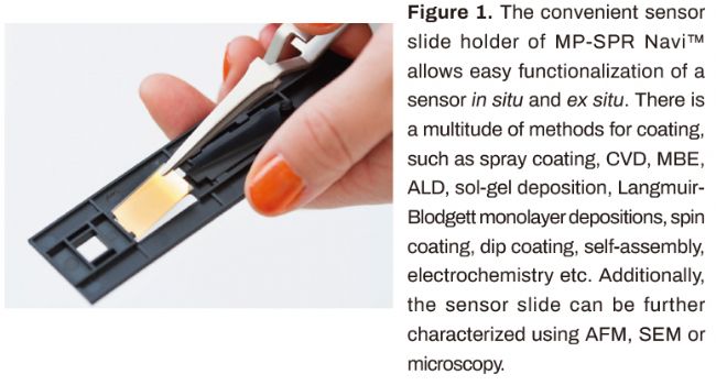 MP-SPR可以測量分子的吸附,同樣的測量也提供了層厚度和光學(xué)性質(zhì)的信息。對于大多數(shù)透明材料,測量的層厚度范圍可以從納米到微米。層表征可以在空氣和各種溶劑中無縫地完成,而不需要改變儀器設(shè)置。與MP-SPR一起使用的彈性體涂層棱鏡允許無油操作,結(jié)合方便的傳感器滑動支架(圖1),可以使用其他方法(如AFM或SEM)進(jìn)一步表征涂層。此外,傳感器滑動片可以很容易地在原位和非原位涂覆。