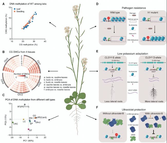 盡管DNA甲基化已被認為與植物適應有關,但證據大多來自顯示DNA甲基化變化與環境變化相關的研究。Jiang等人(2021年)提供了直接證據來說明紫外線照射如何抑制DNA甲基化。擬南芥中的DNA甲基化通過UVB光響應,主要通過UV RESISTANCE LOCUS 8(UVR8,一種UVB光受體)和DRM2(一種新的DNA甲基轉移酶)之間的物理互作實現。UVB照射通過UVR8依賴性通路誘導全基因組DNA低甲基化并解除轉座元件(TEs)抑制。這種UVR8-DRM2介導的TEs重新激活機制可能直接或間接調控參與植物抵御紫外線照射的關鍵基因表達。