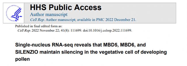 [1] Ichino L, Picard CL, Yun J, et al (2022) Single-nucleus RNA-seq reveals that MBD5, MBD6, and SILENZIO maintain silencing in the vegetative cell of developing pollen. Cell Rep 41:111699. https://doi.org/10.1016/j.celrep.2022.111699