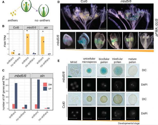 花序組織中,mbd 5/6和sln突變體植物顯示出少量TE和受DNA甲基化調控的基因輕度去阻遏,如基因FWA。為探究沉默喪失是否僅發生在花內的特定細胞類型中,作者將未開放的花蕾中含有發育中花粉粒的花粉囊與花蕾的其余部分(包括心皮、花瓣和萼片)分離(簡稱“無花粉囊”)(圖1A),進行RNA-seq測序以比較野生型、mbd 5/6和sln突變型中的基因表達譜。結果顯示mbd 5/6和sln突變體中的FWA去阻遏僅發生在花藥中(圖1B)。作者構建了轉錄報告細胞系,通過GUS指示FWA的表達,結合DAPI染色,確定了在花藥組織內,FWA僅在雄配子體中從花粉發育的早期階段被重新激活,并且其表達在成熟花粉中降低。
