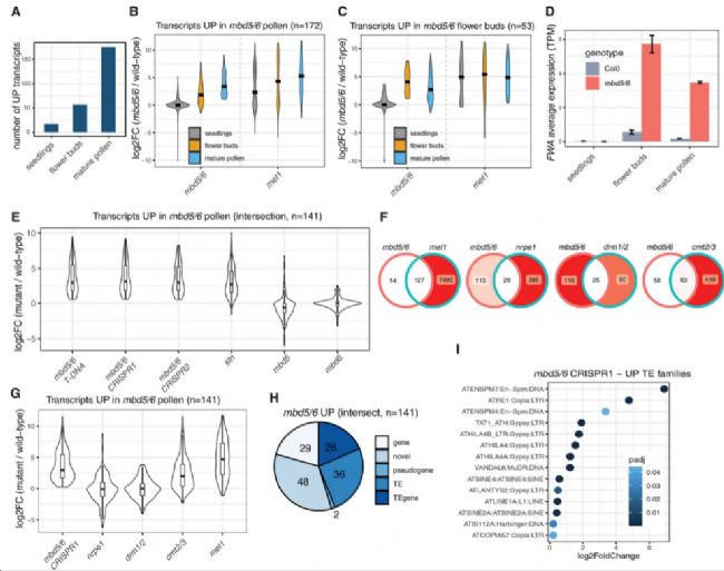 分析花粉RNA-seq數據集,該數據集包括mbd 5和mbd 6單突變體,三種不同的mbd 5/6雙突變體等多種突變體,分析結果顯示mbd 5/6靶標大多是異染色質基因座,且主要是由CG甲基化抑制。MBD5和MBD6廣泛調節被CG甲基化抑制的TE家族。作者還鑒定了一些與FWA相似的功能基因,具有啟動子甲基化并被mbd 5/6和MET 1抑制。在研究的組織中,mbd 5/6和sln的轉錄表型在花粉中最強,并且MBD5/6靶標是被CG甲基化抑制的基因和TE。
