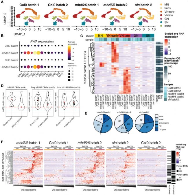為研究花粉發育期間mbd 5/6去阻遏的細胞類型特異性,作者對ColO、mbd 5/6和sln突變體進行snRNA-seq(圖4A)。發現mbd 5/6中,FWA基因在小孢子晚期表達增加,在雙細胞花粉的VN中達到峰值,在VN的雙細胞晚期開始降低(圖4B)。作者將mbd 5/6與每個簇的野生型進行差異比較,發現大多數DEG在早期或晚期VN簇中上調(圖4C),這些基因的特征是啟動子甲基化,其中包括幾個TE和新的注釋(圖4C和4E)。進一步分析VN發育軌跡,發現這些DEG中,54個基因在早期VN中表達,然后沉默。83個DEG基因在晚期VN中上調(圖4F)。有趣的是,在野生型中也觀察到了同樣的模式,但幅度要低得多。表明去阻遏的階段特異性可能反映了所需發育階段特異性轉錄因子的表達。總的來說,snRNA-seq數據揭示mbd 5/6和sln中沉默的喪失開始于小孢子晚期,并且在VN中沿著其發育軌跡逐漸變得更加突出,而GN和SN不受影響。