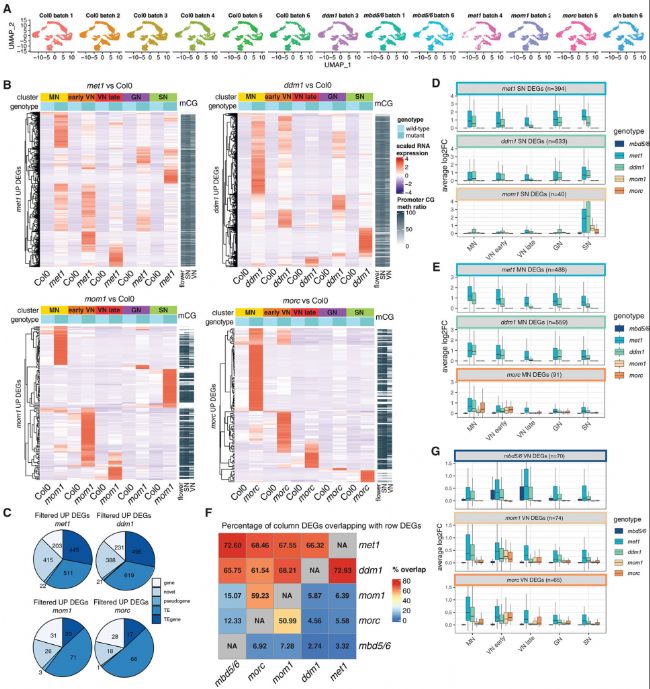 差異分析結(jié)果顯示,在met1、ddm1、mom1、morc等突變體,與mbd5/6和sln的DEG明顯不同,且各突變株的不同細(xì)胞類型中上調(diào)表達(dá)的基因也有不同。比較不同突變體的上調(diào)DEG發(fā)現(xiàn),雖然大部分mbd 5/6靶標(biāo)在metl和ddm1中上調(diào),但它們?cè)趍om1或morc中沒有上調(diào)(圖5F)。同樣,mom1和morc靶標(biāo)主要是met1和ddm1靶標(biāo)的子集,并且它們彼此很大程度上重疊,但在mbd 5/6中沒有上調(diào)(圖5F)。因此,作者猜測(cè)MBD5/6靶標(biāo)構(gòu)成了由DNA甲基化調(diào)控的基因座的獨(dú)特子集。
