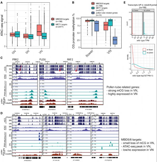 為探究VN細(xì)胞中的松弛染色質(zhì)狀態(tài)是否與mbd 5/6中沉默喪失的VN特異性有關(guān),作者分析了包括從野生型GN、SN和成熟VN分離的細(xì)胞核進(jìn)行的轉(zhuǎn)座酶可及染色質(zhì)測(cè)序結(jié)果。作者觀察到,在野生型VN中,mbd 5/6靶標(biāo)處染色質(zhì)可及性明顯增加,并且在VN中失去更多的CG甲基化,這可能是因?yàn)閱?dòng)子的開放性促進(jìn)DME的接近(圖6B)。然而,雖然VN中特定花粉育性基因的DME介導(dǎo)的去甲基化是非常廣泛的,導(dǎo)致這些基因高度表達(dá)并且不受mbd 5/6調(diào)節(jié),但是mbd 5/6靶標(biāo)處的甲基化損失較溫和,并且僅導(dǎo)致野生型VN中非常低的表達(dá)水平(圖6B-E)。