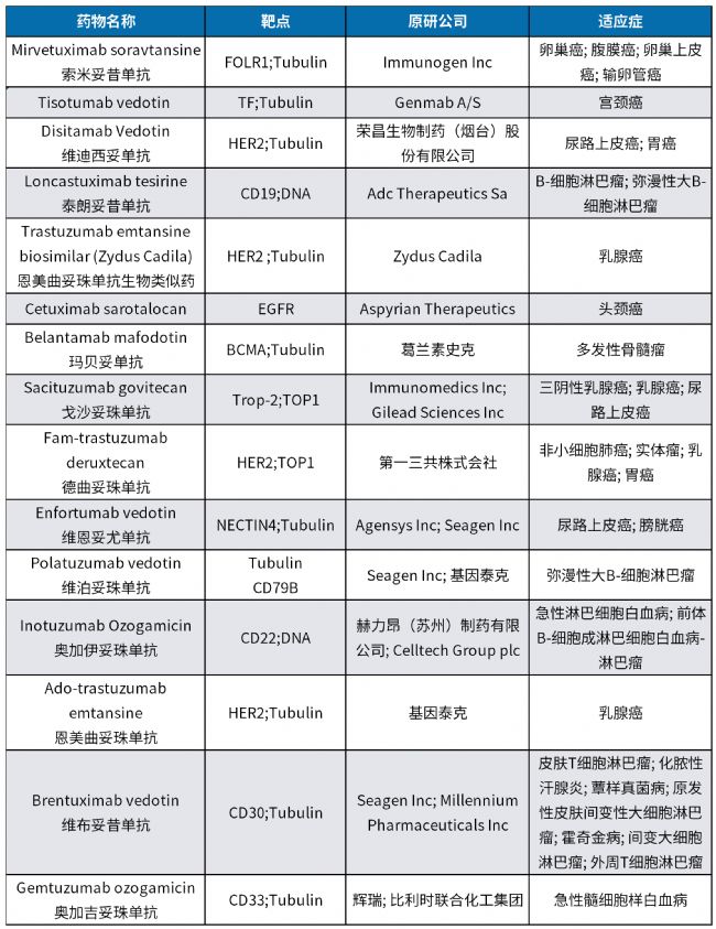 自2000年美國食品藥品監督管理局(FDA)批準首個ADC藥物Mylotarg成功上市以來,20多年里全球已經有15款ADC藥物獲FDA批準上市(如下表),用于治療血液惡性腫瘤和實體瘤。此外,超過400種ADC藥物正處于不同的研發階段。