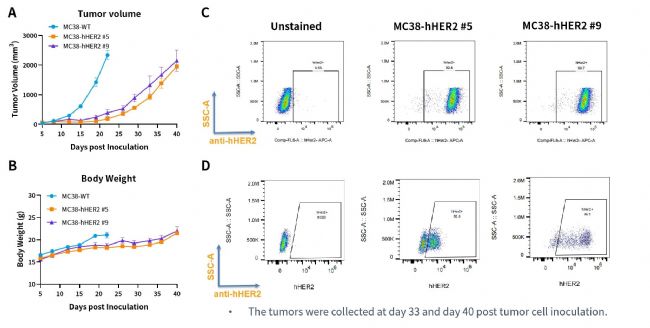 圖4. A、B:在C57BL/6背景小鼠上接種南模生物自主研發的MC38-hHER2細胞系,檢驗成瘤情況。C、D:流式檢測MC38-hHER2人源化細系中人源HER2的表達。