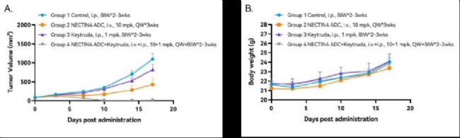 圖6. 靶向NECTIN4的ADC藥物抑制MC38-hNectin4同系腫瘤細胞進展的體內藥效 (宿主小鼠為C57BL/6背景的hPD-1小鼠)。a.每組小鼠的相對腫瘤體積變化曲線,b.體重。
