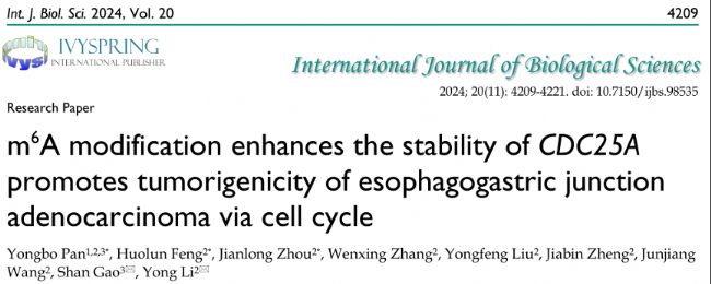 Pan Y, Feng H, Zhou J, Zhang W, Liu Y, Zheng J, Wang J, Gao S, Li Y. m6A modification enhances the stability of CDC25A promotes tumorigenicity of esophagogastric junction adenocarcinoma via cell cycle. Int J Biol Sci. 2024;20(11):4209-4221. pii: ijbsv20p4209. doi: 10.7150/ijbs.98535. PubMed PMID: 39247830.