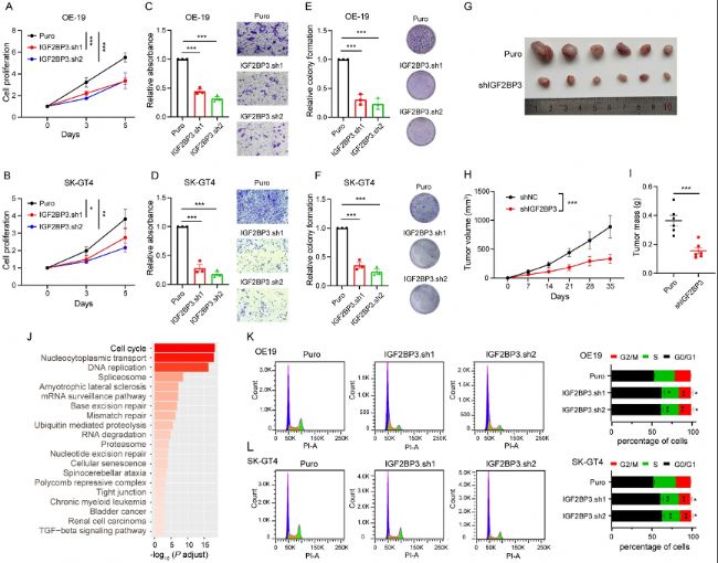 (K-L) 流式細(xì)胞術(shù)分析顯示IGF2BP3-KD OE-19 (K) 和 SK-GT4 (L) 細(xì)胞在sub-G0-G1期、S期和G2-M期細(xì)胞周期階段的百分比(n = 3)。顯示代表性的細(xì)胞周期圖譜(左)和定量分析(右)。