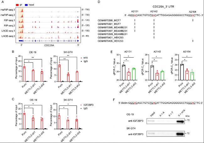 (E) METTL3 KD OE-19和SK-GT4細(xì)胞中CDC25A的qRT-PCR分析。