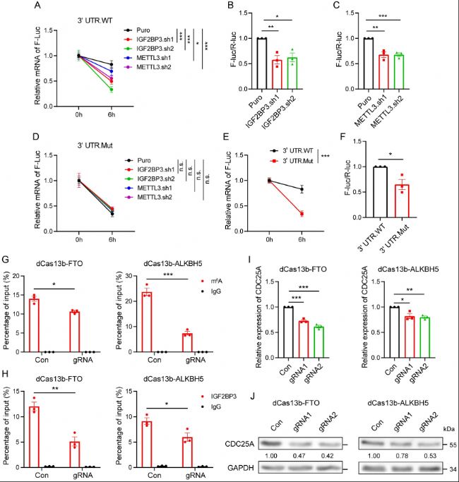 (B和C) 雙熒光素酶檢測顯示IGF2BP3或METTL3 KD 293T細(xì)胞中CDC25A 3' UTR的熒光素酶活性。(E) 293T細(xì)胞用5μM放線菌素D處理指定時間后,耦聯(lián)3'UTR野生型和突變型F-Luc半衰期。