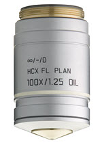 以下圖為例,物鏡上標識的“100X/1.25 OIL”,指100倍放大倍數,NA=1.25,“OIL”指需要使用鏡油。