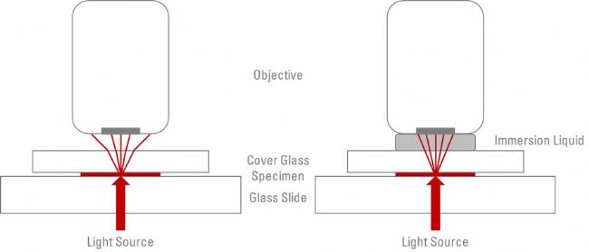 要用顯微鏡在高倍鏡下檢查樣品,有許多因素需要考慮,其中包括分辨率、數值孔徑(NA)、物鏡的工作距離,以及物鏡前透鏡采集圖像所用介質的折射率。我們通過這篇文章簡要地看一下如何在蓋玻片和物鏡前透鏡之間利用鏡油幫助提高NA和分辨率,提高成像質量。