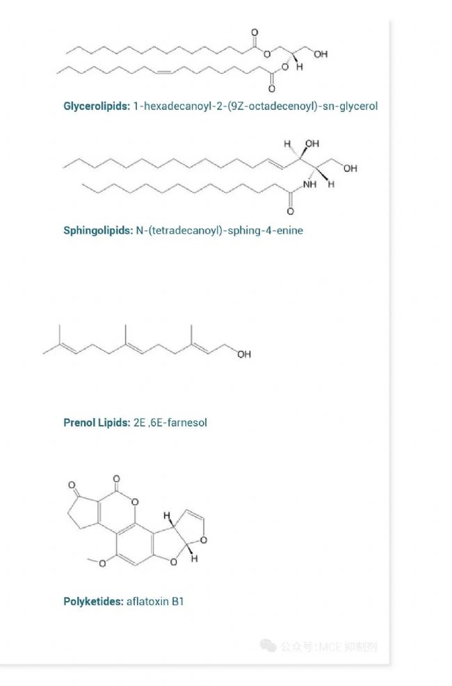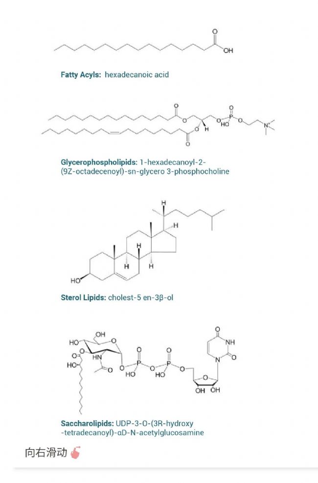 來自 LIPID MAPS (The Lipid Metabolites and Pathways Strategy,脂質代謝產物和途徑策略) 脂質分類中的 8 個代表性結構。