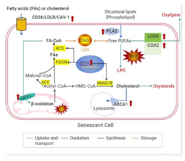 研究表明,脂質代謝調節細胞衰老。細胞衰老涉及的主要脂質代謝過程包括脂質攝取、運輸、合成、氧化和脂質儲存,這些過程與衰老細胞的存活和衰老相關分泌表型 (SASP) 分泌密切相關。