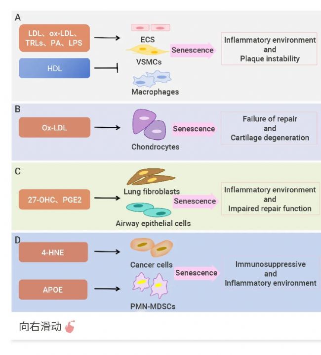 Ox-LDL 誘導軟骨細胞衰老,導致修復失敗和軟骨降解 (圖 4B)。而對于慢性阻塞性肺病 COPD,氧固醇 27-OHC 和氧脂質 PGE2 通過誘導肺成纖維細胞和氣道上皮衰老來促進炎癥和受損的修復功能 (圖 4C)。脂質過氧化產物 4-HNE 推動癌癥細胞衰老,APOE 驅動 PMN-MDSC (多形核髓系來源的抑制細胞) 衰老,導致癌癥微環境中的免疫抑制和腫瘤促進 (圖 4D)。