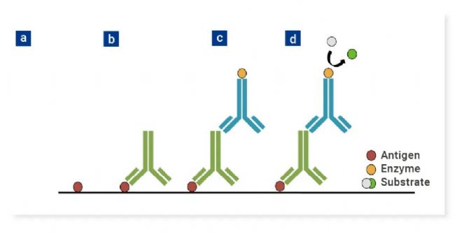 將含有分析物的緩沖溶液加入 96 孔板中,讓其粘附在塑料板上一段時間 (圖 2a)。在直接 ELISA 中,加入帶有偶聯酶的一級檢測抗體,該抗體與覆蓋孔的抗原結合 (圖 2b)。將板孵育足夠長的時間以使抗原-抗體結合,并用磷酸鹽緩沖鹽水清洗以去除多余的抗體,然后加入酶的底物,在黑暗環境中等待酶-底物相互作用,然后用特定溶液停止反應。酶-底物相互作用導致顏色形成,可通過微孔板讀數器檢測到 (圖 2c)。分析時,將樣品讀數與標準曲線進行比較。