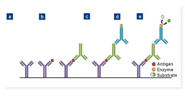 將含有捕獲抗體的包被緩沖液加入孔板中并使其粘附 (圖 4a)。孵育后,清洗孔板并加入封閉緩沖液以封閉孔上任何剩余的結合位點。然后將樣品加入每個孔中并孵育特定時間 (圖 4b)。為確保結果的準確性,必須對每個孔板運行標準樣品 (陽性對照) 和空白樣品 (陰性對照)。然后將檢測抗體加入每個孔中 (圖 4c),隨后加入偶聯的二抗和封閉緩沖液 (圖 4d)。在每個步驟之間,用磷酸鹽緩沖鹽水清洗孔。加入底物溶液并使用微孔板讀數器檢測結果 (圖 4e)。