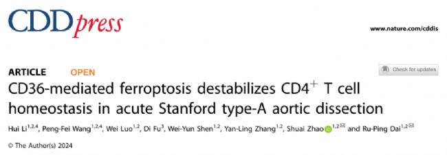 近日,中南大學湘雅二醫院麻醉科戴茹萍教授和李卉副教授團隊在《Cell Death and Disease》(2024, 15:669)上發表了題為“CD36-mediated ferroptosis destabilizes CD4+ T cell homeostasis in acute Stanford type-A aortic dissection”的研究論文。該研究揭示了ATAAD患者循環CD4+ T細胞的功能缺陷特征,并發現CD36促進脂肪酸攝取驅動了CD4+ T細胞的鐵死亡,從而導致患者CD4+ T細胞功能障礙。通過靶向CD4+ T細胞鐵死亡途徑逆轉了其功能缺陷,為揭示ATAAD的發病機制提供了新的理論依據,并提出了潛在的臨床治療靶點。