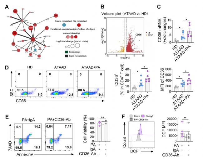 研究者通過蛋白互作分析發現,CD36是連接脂質代謝與鐵死亡的關鍵基因。檢測結果顯示,ATAAD患者的CD4+ T細胞中CD36表達顯著上調。利用CD36單抗干預后,發現其可有效減少PA誘導的CD4+ T細胞鐵死亡,并顯著恢復細胞活性(圖4)。這一結果提示,靶向CD36-鐵死亡通路可能成為改善CD4+ T細胞功能異常的潛在治療策略(圖5)。
