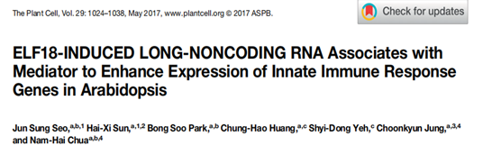 植物和動物在自然環境中都面臨著被各種微生物感染的風險。與動物一樣,植物也演化出了一套模式識別受體(PRRs),這些受體能識別整個微生物病原體類別的分子特征,進而啟動先天免疫反應。本文鑒定了擬南芥中一種長非編碼RNA(lncRNA)-ELENA1,通過In Vitro RNA Pull-Down、RIP等技術揭示了ELENA1調控擬南芥抗病性的機制。