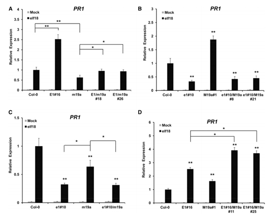 為了研究ELENA1、MED19a、PR1表達間的關系,作者構建了四種不同的ELENA1和MED19a的雙轉基因株系分別為35S:ELENA1/med19a-1(E1/m19a)、ELENA1KD-10/UBQ:MED19a(e1#10/M19a)、ELENA1KD-10/med19a-1 (e1#10/m19a)和35S:ELENA1-16/UBQ:MED19a (E1#16/M19a)。使用elf18進行處理,通過RT-qPCR實驗對不同株系的相關基因表達情況進行分析。結果顯示,E1/m19a株系與ELENA1過表達植物 (E1#16) 相比PR1表達顯著下降,但略高于med19a-1突變體(m19a)。在ELENA1 KD突變體背景中,MED19a的過表達(e1#10/M19a)對PR1表達沒有顯著影響,與e1#10/M19a相比E1#16/M19a株系PR1表達更高,說明ELENA1和MED19a相互作用進一步增強PR1表達。以上結果說明在elf18處理下,MED19a對PR1表達的促進作用依賴于ELENA1,但在MED19a之外,還有其他因素與ELENA1相關聯以促進PR1表達。