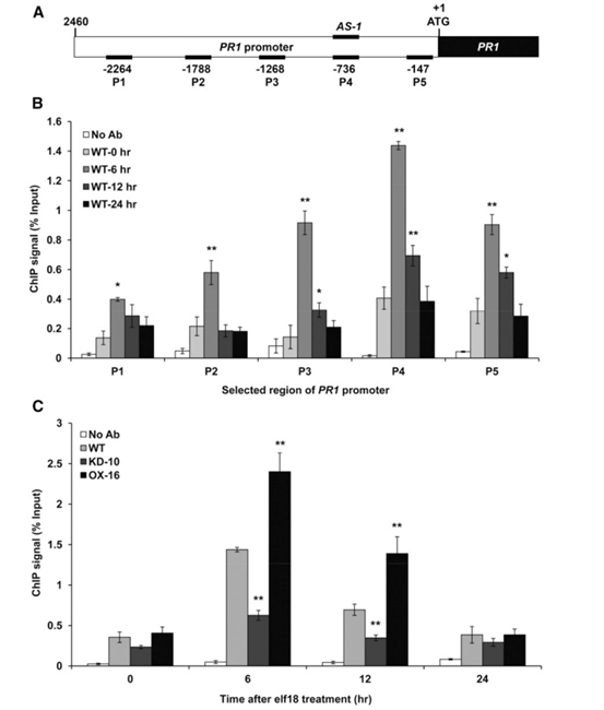 為了研究ELENA1和MED19a是直接還是間接調控PR1基因表達,作者構建了轉基因株系PMED19a:GFP-MED19a,通過染色質免疫沉淀(ChIP)、qPCR定量實驗顯示MED19a富集在含有AS-1類似元素的PR1啟動子P4區域。使用elf18進行處理,發現MED19a在PR1啟動子上的富集在處理后6小時達到最高,在12小時減少。同時觀察了突變體中MED19的富集情況,與野生型相比,在ELENA1敲除株系中MED19a在PR1啟動子P4區域的富集大幅減少,而ELENA1過表達株系中MED19a的富集增加。以上結果說明ELENA1促進了MED19a在PR1啟動子上的富集。