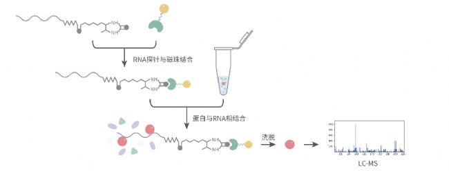 RNA Pull Down是根據已知的RNA序列,設計DNA模版,然后使用體外轉錄技術合成帶標記的RNA探針,并與蛋白提取液進行孵育,形成RNA-蛋白質復合體。使用鏈霉親和素磁珠純化富集RNA-蛋白質復合體,將富集到的蛋白質進行LC-MS/MS檢測,最終鑒定出與RNA互作的蛋白質。