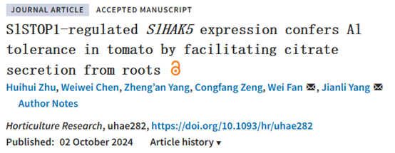 2024年10月2日,云南農(nóng)業(yè)大學(xué)園林園藝學(xué)院營養(yǎng)逆境與品質(zhì)改良楊建立/范偉團隊在Horticulture Research期刊(IF=7.6)上在線發(fā)表題為“SlSTOP1-regulated SlHAK5 expression confers Al tolerance in tomato by facilitating citrate secretion from roots”的研究論文。該研究通過DAP-seq和RNA-seq在全基因組水平挖掘了番茄抗酸鋁核心轉(zhuǎn)錄因子SlSTOP1互作位點,明確了受SlSTOP1直接調(diào)控的抗酸鋁基因,并對其中一個與鉀離子轉(zhuǎn)運有關(guān)的轉(zhuǎn)運蛋白基因SlHAK5在抗酸鋁中的功能進行了解析。