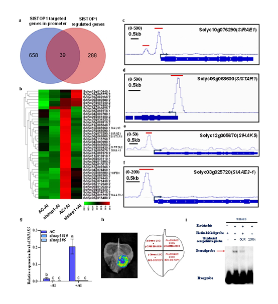為了確定SlSTOP1在鋁脅迫下的直接靶點,作者對多組樣本進行了轉(zhuǎn)錄組測序,將RNA-seq中的327個overlap DEGs與DAP-seq中的啟動子靶向基因進行聯(lián)合分析。結(jié)果發(fā)現(xiàn),在鋁脅迫下SlSTOP1通過與39個基因的啟動子結(jié)合進行轉(zhuǎn)錄調(diào)控。這些SlSTOP1直接調(diào)控的Al應(yīng)答基因在功能上可分為轉(zhuǎn)運體、轉(zhuǎn)錄因子、信號傳導(dǎo)、代謝等基因。39個基因中有7個與已知的耐鋁基因同源,表明這些目標基因可能是番茄中最重要的耐鋁基因。作者將基因SlRAE1、SlSTAR1、SlHAK5和SlAAE3-1進行可視化,發(fā)現(xiàn)SlSTOP1與這些基因的結(jié)合位點位于tss附近。隨后作者挑選了SlHAK5基因進行雙熒光素酶報告實驗和EMSA驗證。