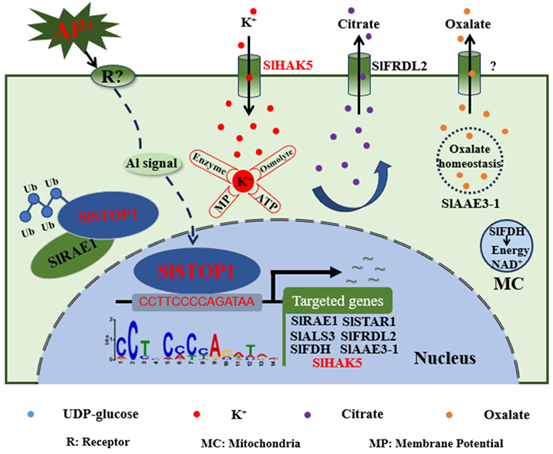 本研究成功挖掘到酸鋁脅迫下受SlSTOP1直接調(diào)控的39個下游靶基因,包括課題組先前發(fā)現(xiàn)的甲酸鹽脫氫酶基因SlFDH(The Plant Journal,2023,113:387–401;doi: 10.1111/tpj.16054)和本研究中揭示的鉀離子轉(zhuǎn)運蛋白基因SlHAK5。上述研究的發(fā)現(xiàn)進一步闡明了番茄抗酸鋁核心分子調(diào)控網(wǎng)絡(luò),為創(chuàng)制耐酸鋁番茄新種質(zhì)奠定了基礎(chǔ)。