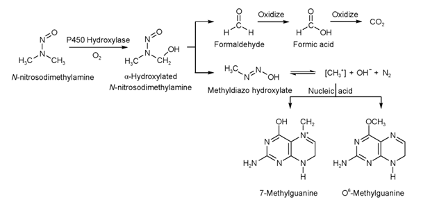 N-亞硝胺類雜質(N-nitrosamines)產生強烈致癌性的遺傳毒性的物質基礎并非原型物質,而是其代謝產物。在諸多N-亞硝胺類化合物致癌機制中,當前最廣為接受的是ɑ-羥基化假說,即N⁃亞硝胺ɑ-碳上的氫經多種氧化酶和氧合酶(如細胞色素酶P450 CYP2E1和CYP2A6等)羥基化后可形成致癌物。N⁃亞硝胺首先被羥化酶激活生成α⁃羥基化亞硝胺,這是一種不穩定且具有誘變性的中間體,可自發分解成甲醛和甲基重氮羥化物。甲醛可以依次氧化生成甲酸和二氧化碳,甲基重氮羥化物可以分解成烷基重氮離子,它可以與DNA堿基對反應,使DNA堿基烷基化生成烷基鳥嘌呤并誘發致癌反應。以NDMA為例,其具體致癌機理如圖1所示。