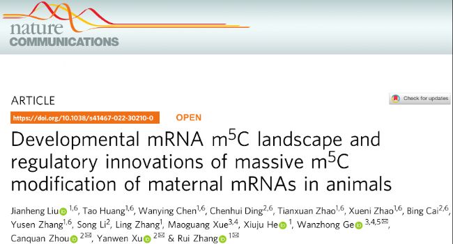 Liu J, Huang T, Chen W, Ding C, Zhao T, Zhao X, Cai B, Zhang Y, Li S, Zhang L, Xue M, He X, Ge W, Zhou C, Xu Y, Zhang R. Developmental mRNA m5C landscape and regulatory innovations of massive m5C modification of maternal mRNAs in animals. Nat Commun. 2022 May 5;13(1):2484. pii: 10.1038/s41467-022-30210-0. doi: 10.1038/s41467-022-30210-0. PubMed PMID: 35513466.