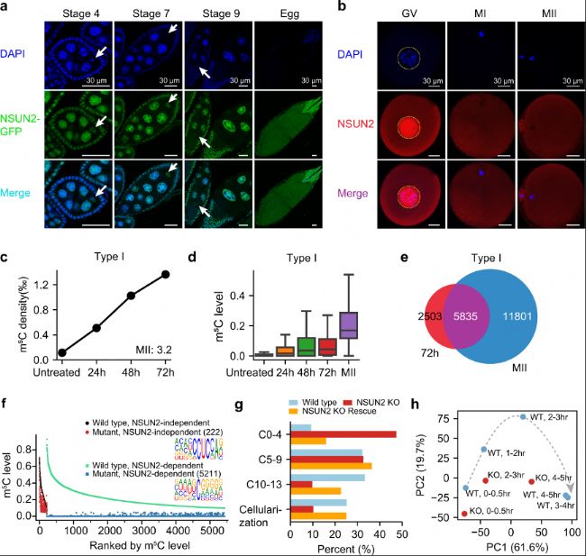 圖2:卵母細胞中mRNA m5C的沉積以及NSUN2在早期胚胎發生中的體內功能。