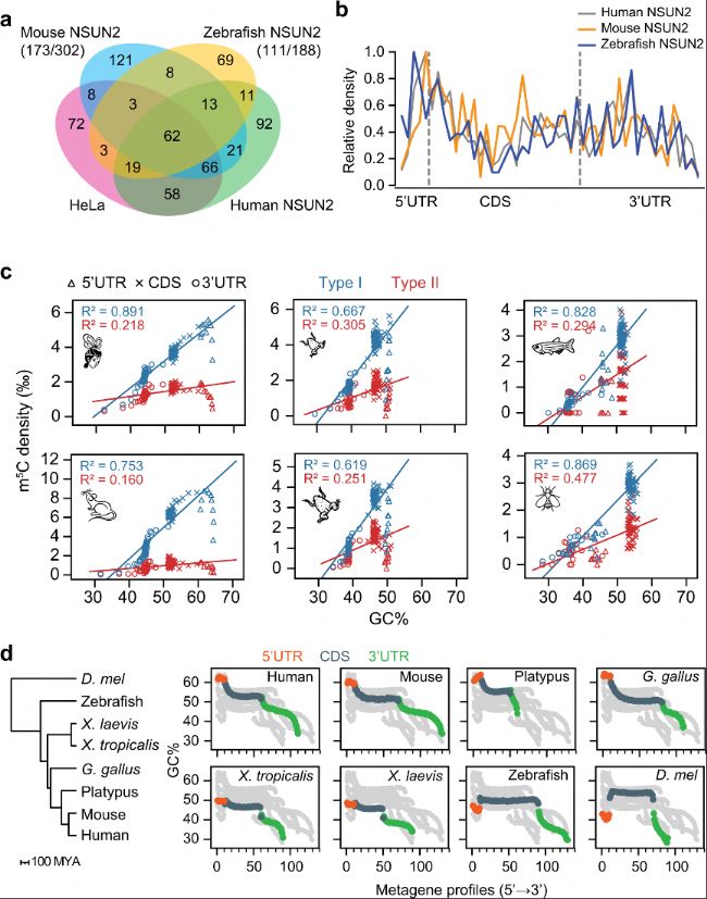 b. 在單獨表達人類、小鼠和斑馬魚NSUN2的NSUN2敲除HeLa細胞中Type I m5C位點的分布。