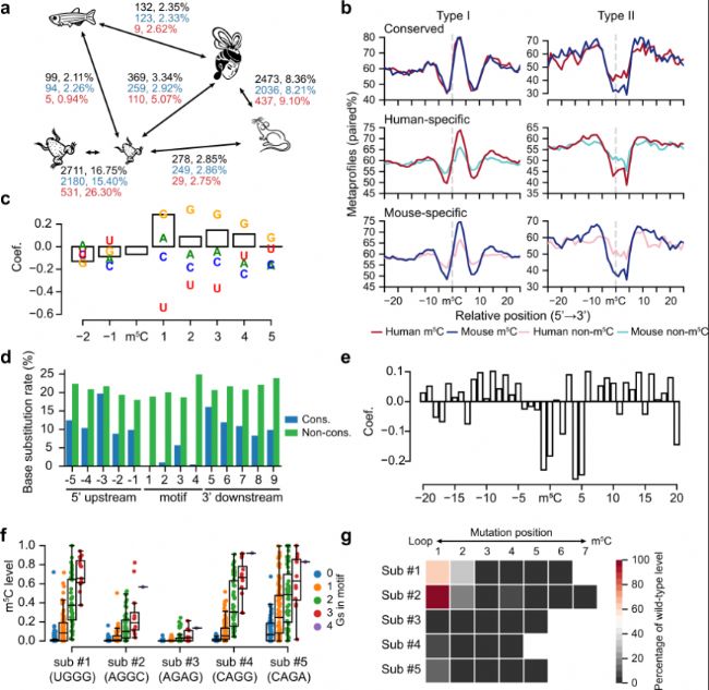 a. 脊椎動物物種間保守m5C位點的數量和百分比的成對比較。線條的長度與物種間的分化時間成比例。分別展示了所有m5C位點(黑色)、Type I m5C位點(藍色)和Type II m5C位點(紅色)的數量和百分比。使用的樣本:人類和小鼠,MII期卵母細胞;青蛙,0期;斑馬魚,0小時受精后(hpf);果蠅,0-0.5小時胚胎。保守的甲基化位點,指在一個物種中水平≥10%,在另一個物種中水平>5%的m5C位點。只考慮在兩個物種中至少被十次reads覆蓋的保守C。