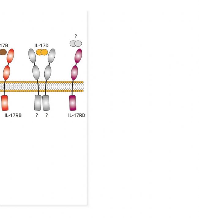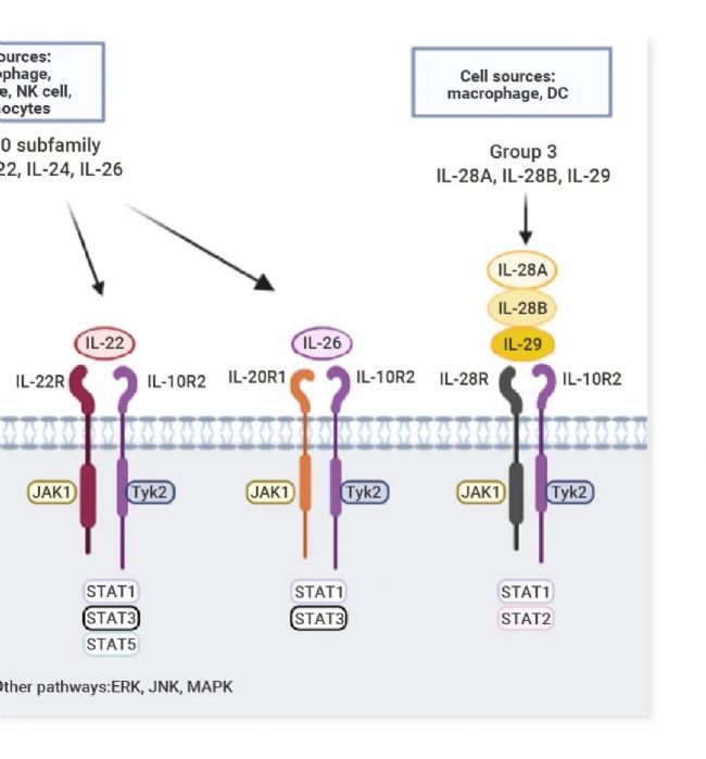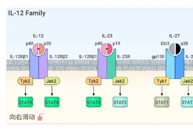 ▐ 特征:均由異二聚體構成,具體為 α 亞基 (p19、p28、p35) 和 β 亞基 (p40、Ebi3) 的不同組合:構成 IL-12 (p35/p40)、IL-23 (p19/p40)、IL-27 (p28/Ebi3)、IL-35 (p35/Ebi3)、IL-39 (p19/Ebi3)。α 亞基具有 IL-6 超家族的四螺旋束結構特征,β 亞基與 1 型細胞因子受體胞外區結構相關。