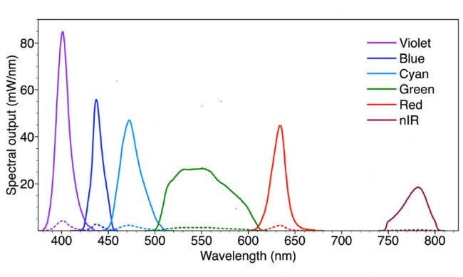 在實(shí)際應(yīng)用中,SPECTRA的五個(gè)可見光范圍光源(紫色、藍(lán)色、青色、綠色和紅色、圖2)可組合使用,產(chǎn)生具有相關(guān)色溫(CCT)和顯色指數(shù)(CRI)特征的白光,這些特征針對大體解剖的反射光成像進(jìn)行了優(yōu)化。