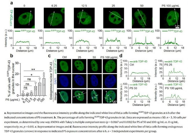 ①Sun, H., Yang, B., Li, Q. et al. Polystyrene nanoparticles trigger aberrant condensation of TDP-43 and amyotrophic lateral sclerosis-like symptoms. Nat. Nanotechnol. (2024). https://doi.org/10.1038/s41565-024-01683-5