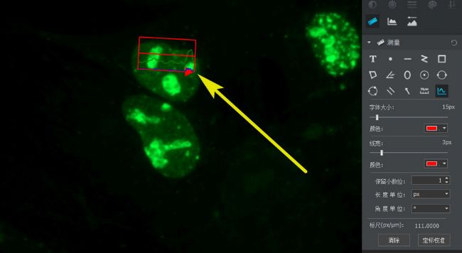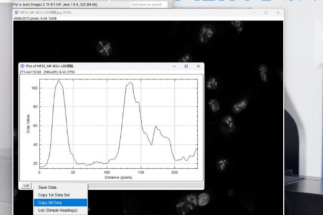 能量曲線方便易用,直觀快速但不夠量化,要更量化地進行徑向熒光強度分析,需要用到ImageJ或者說FIJI(JIFI是更新版的ImageJ).首先打開熒光圖片,使用直線工具畫線,注意畫線對比時長度數據要一致。