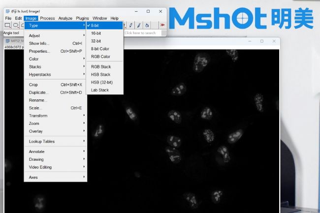 我們這個熒光圖是單色熒光,因此我們這里先將其轉化成8bit格式,減少其他通道信號可能帶來的問題,在菜單選項選擇Image-Type-8bit.