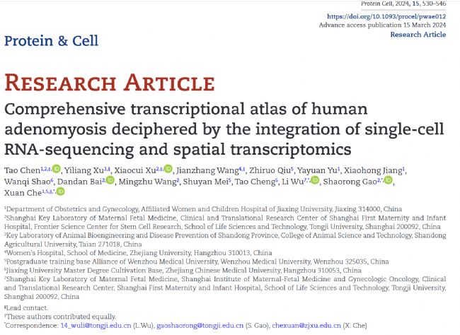 Chen T, Xu Y, Xu X, Wang J, Qiu Z, Yu Y, Jiang X, Shao W, Bai D, Wang M, Mei S, Cheng T, Wu L, Gao S, Che X. Comprehensive transcriptional atlas of human adenomyosis deciphered by the integration of single-cell RNA-sequencing and spatial transcriptomics. Protein Cell. 2024 Jul 1;15(7):530-546. doi: 10.1093/procel/pwae012. PMID: 38486356; PMCID: PMC11214835.