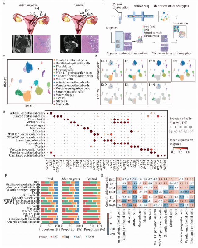 子宮腺肌病是一種尚未完全了解的婦科疾病。為了解決這些空白,在本研究中,我們對覆蓋整個子宮所有重要區域的子宮腺肌病和對照樣本進行了單細胞RNA測序和空間轉錄組學分析。這使我們能夠全面表征子宮腺肌癥的細胞異質性,并闡明區域分子異質性,特別是在關鍵的子宮內膜-子宮內膜交界處。我們確定了腺肌病病變特有的獨特上皮和基質亞群,揭示了復雜的血管生成微環境,并描繪了改變的細胞間通訊。離散細胞群、異常信號程序和區域差異的識別促進了我們對子宮腺肌癥發病機制中復雜分子景觀的理解。