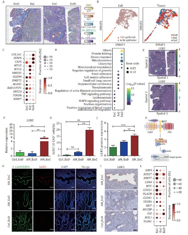 我們首先利用結合scRNA-seq數據的空間轉錄組學技術展示了子宮腺肌癥的整體景觀。在腺肌病變中,上皮細胞被基質細胞包圍,與異位子宮內膜相比,異位病變表現出STEAP4+血管周圍細胞(PV STEAP4)的富集,這表明血管生成微環境可能有助于子宮腺肌癥的進展(圖2A)。然后,將上皮細胞分為纖毛細胞亞組和非纖毛細胞亞組(圖2B)。盡管它們在不同區域(EnC, EnJ, EnD)的分布是一致的(圖2B),但它們的基因表達卻存在顯著差異(圖2C)。在EnC上皮細胞中特異性表達的基因,如基質金屬肽酶7 (MMP7)、血小板衍生生長因子亞基A (PDGFA)、KRT23(角蛋白23)、DMBT1(在惡性腦腫瘤中缺失1)和CLDN4 (claudin 4),在遷移、血管生成和增殖相關的過程中表現出富集(圖2C)。GO富集分析顯示,基因富集于“調節肌動蛋白絲聚合”、“正向調節血管內皮細胞遷移”以及“腫瘤壞死因子(TNF)信號通路”和“MAPK信號通路”(圖2D)。相反,在EnJ上皮細胞中特異性表達的基因表現出與細胞生長和細胞基質粘附相關的金屬硫蛋白1E (MT1E)、金屬硫蛋白1G (MT1G)和血紅素加氧酶1 (HMOX1)的顯著上調(圖2C和2D)。這些數據表明,子宮內膜-子宮肌交界處的上皮細胞因基質重塑而發生改變,病變中的細胞表現出遷移和增殖特征。