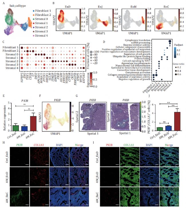由于基質簇2被認為是一個病變特異性亞群,我們首先通過qRT-PCR驗證了基質簇2特異性表達的基因,包括ENPP2和PKIB。結果顯示,與對照組和子宮腺肌癥患者的EnD基質細胞相比,這兩個基因在異位基質細胞中顯著上調(圖3E)。此外,空間轉錄組顯示,PKIB+和ENPP2+基質細胞在異位病變中獨特地分布在上皮細胞周圍(圖3G)。熒光原位雜交(FISH)和免疫熒光(IF)染色證實了基質簇2的存在和組織學分布(圖3H-J)。總之,我們的研究結果揭示了子宮腺肌病中病變特異性基質亞細胞類型,并發現PKIB,一種與細胞增殖和侵襲相關的基因,影響各種細胞過程,在該集群中顯著增加。該研究確定了子宮腺肌癥中5個間質和2個成纖維細胞亞群,其中一個病變特異性間質簇2表達增殖和侵襲相關的PKIB,可能與子宮腺肌癥的發病機制有關。